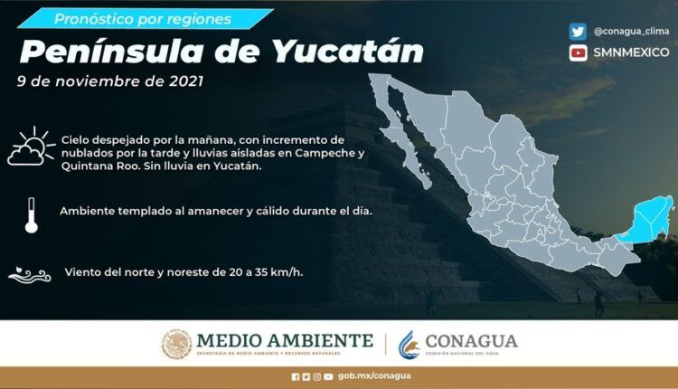 Península de Yucatán: Cielo despejado por la mañana, con incremento de nublados por la tarde y lluvias aisladas en Campeche y Quintana Roo. Sin lluvia en Yucatán. Ambiente templado al amanecer y cálido durante el día. Viento del norte y noreste de 20 a 35 km/h.