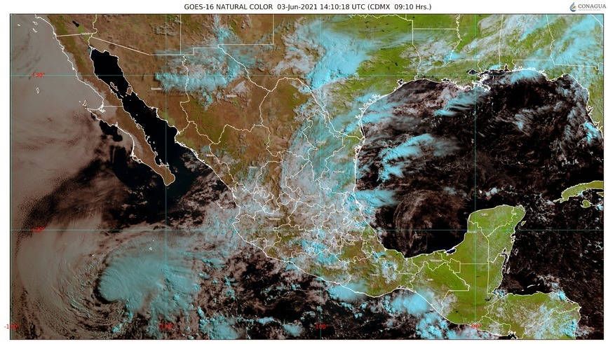 Un segundo canal de baja presión sobre el noreste y oriente del territorio nacional, en combinación con la entrada de humedad del Océano Pacífico y Golfo de México, originará lluvias muy fuertes a puntuales intensas, descargas eléctricas, posibles granizadas y fuertes rachas de viento sobre dichas regiones. La Depresión Tropical “BLANCA” en el Océano Pacífico deja de afectar paulatinamente a las costas de México.