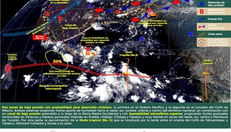 Para hoy, continuarán dos zonas de baja presión con probabilidad para desarrollo ciclónico, la primera en el Océano Pacífico, y la segunda en el suroeste del Golfo de México. Ambos sistemas ocasionan fuerte aporte de humedad hacia el oeste, sur, sureste, oriente y centro del territorio nacional, en combinación con un canal de baja presión extendido a lo largo de la Sierra Madre Occidental y con inestabilidad atmosférica superior, propiciarán lluvias puntuales torrenciales en Veracruz y Oaxaca; puntuales intensas en Puebla, Hidalgo, Chiapas y Tabasco y muy fuertes en zonas del oeste, sur, centro y Península de Yucatán.