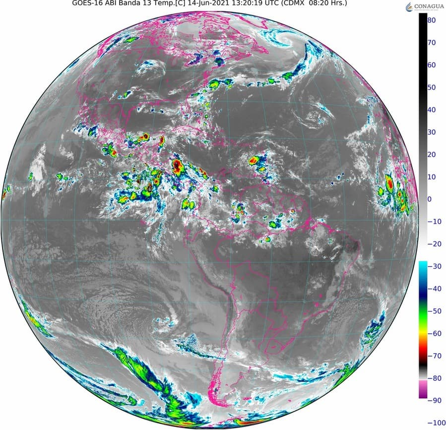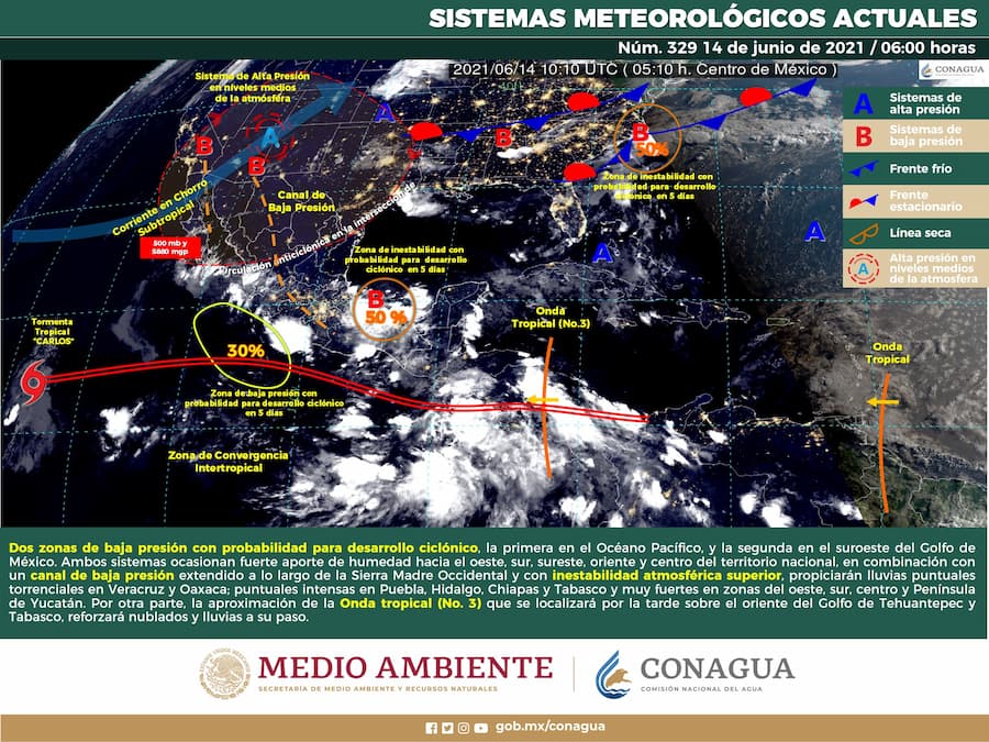 Para hoy, continuarán dos zonas de baja presión con probabilidad para desarrollo ciclónico, la primera en el Océano Pacífico, y la segunda en el suroeste del Golfo de México. Ambos sistemas ocasionan fuerte aporte de humedad hacia el oeste, sur, sureste, oriente y centro del territorio nacional, en combinación con un canal de baja presión extendido a lo largo de la Sierra Madre Occidental y con inestabilidad atmosférica superior, propiciarán lluvias puntuales torrenciales en Veracruz y Oaxaca; puntuales intensas en Puebla, Hidalgo, Chiapas y Tabasco y muy fuertes en zonas del oeste, sur, centro y Península de Yucatán.
