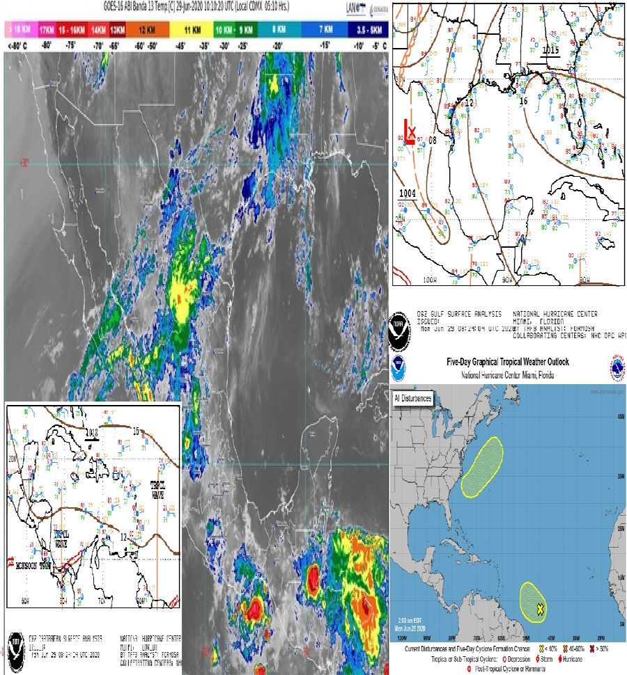 El pronóstico meteorológico para el Golfo de México es ambiente muy caluroso, cielo parcialmente nublado por la mañana e incremento de nublados hacia la tarde. Se prevén intervalos de chubascos en Tabasco y Veracruz, y lluvias aisladas en Tamaulipas, además de viento del sureste de 20 a 30 km/h, con rachas de 50 a 60 km/h y posibles tolvaneras en Tamaulipas.