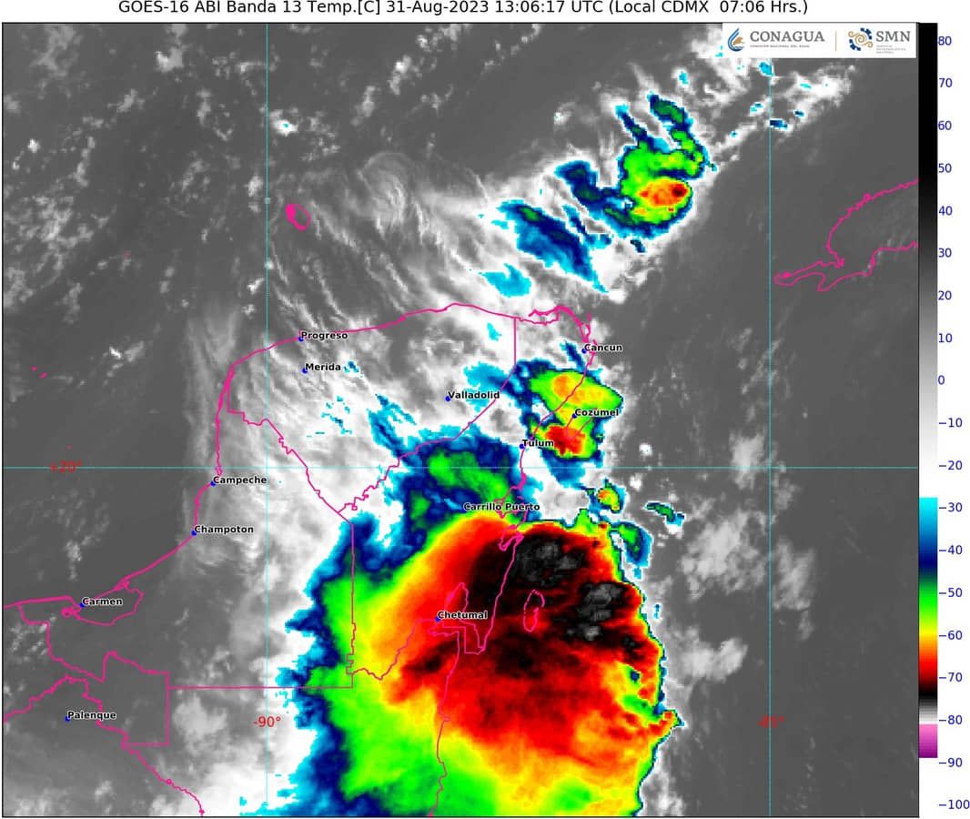 Canales de baja presión, sobre la Península de Yucatán, el occidente, oriente, centro, sur y sureste del territorio nacional, aunado a inestabilidad en niveles altos de la atmósfera, el ingreso de humedad del Océano Pacífico, Golfo de México y Mar Caribe, así como la proximidad de la vaguada monzónica a las costas del Pacífico Sur Mexicano, producirán chubascos y lluvias fuertes a muy fuertes, descargas eléctricas y rachas de viento sobre las regiones mencionadas, con lluvias puntuales intensas en zonas de Morelos, Puebla, Veracruz y Chiapas.