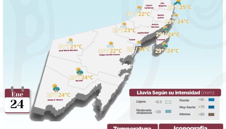 Se mantiene la afluencia de aire húmedo proveniente del Mar Caribe hacia la región peninsular y el estado de Quintana Roo, originará cielo medio nublado con incremento de nublados durante el transcurso del día, lluvias con intervalos de chubascos sobre algunas partes del Estado, las temperaturas serán calurosas durante el día y cálidas por la noche y madrugada. Así mismo continuará el evento de “Surada” con vientos principalmente del sureste de 35 a 45 km/h sobre las zonas de costa del Estado.