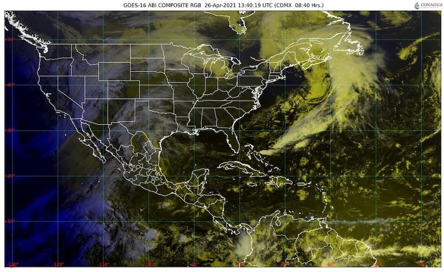 Además, un sistema de alta presión en niveles medios de la atmósfera mantendrá el ambiente de caluroso a muy caluroso sobre gran parte de la República Mexicana, con temperaturas máximas de 40 a 45 grados Celsius en zonas de Campeche, Chiapas, Guerrero, Michoacán, Oaxaca, Tabasco y Veracruz, y de 35 a 40 grados Celsius en sitios de Chihuahua, Coahuila, Colima, el suroeste del Estado de México, Guanajuato, el norte de Hidalgo, Jalisco, Morelos, Nayarit, Nuevo León, el norte y suroeste de Puebla, el norte de Querétaro, Quintana Roo, San Luis Potosí, Sinaloa, Tamaulipas y Yucatán.