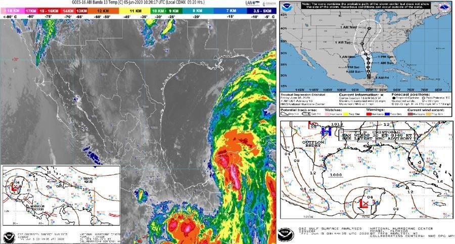 Para hoy, se pronostica que el centro de la Depresión tropical “Cristóbal” continúe su desplazamiento hacia el norte sobre Campeche y el occidente de Yucatán, para que durante esta noche ingrese al Golfo de México, en donde se podrá intensificar nuevamente a Tormenta Tropical.