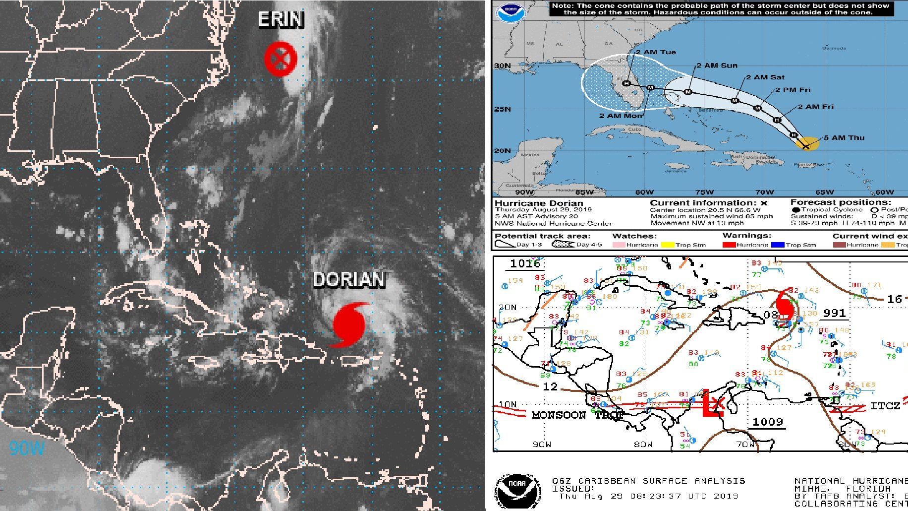 La Tormenta Tropical “DORIAN” del Mar Caribe; en el transcurso de la tarde de hoy evolucionó a Huracán categoría uno en la escala Saffir-Simpson; localizándose a las 05:00 horas en las coordenadas 20.5° grados latitud norte y 66.6° grados longitud oeste, aproximadamente a 240 kms., al nor-noroeste de San Juan de Puerto Rico, presenta movimiento al noroeste (325º grados) a razón de 20 kph., con vientos máximos cerca del centro de 140 kph., y rachas mayores; los vientos de huracán se extienden a 30 kms., y de Tormenta Tropical hasta 150 kms., del centro a la periferia del sistema.