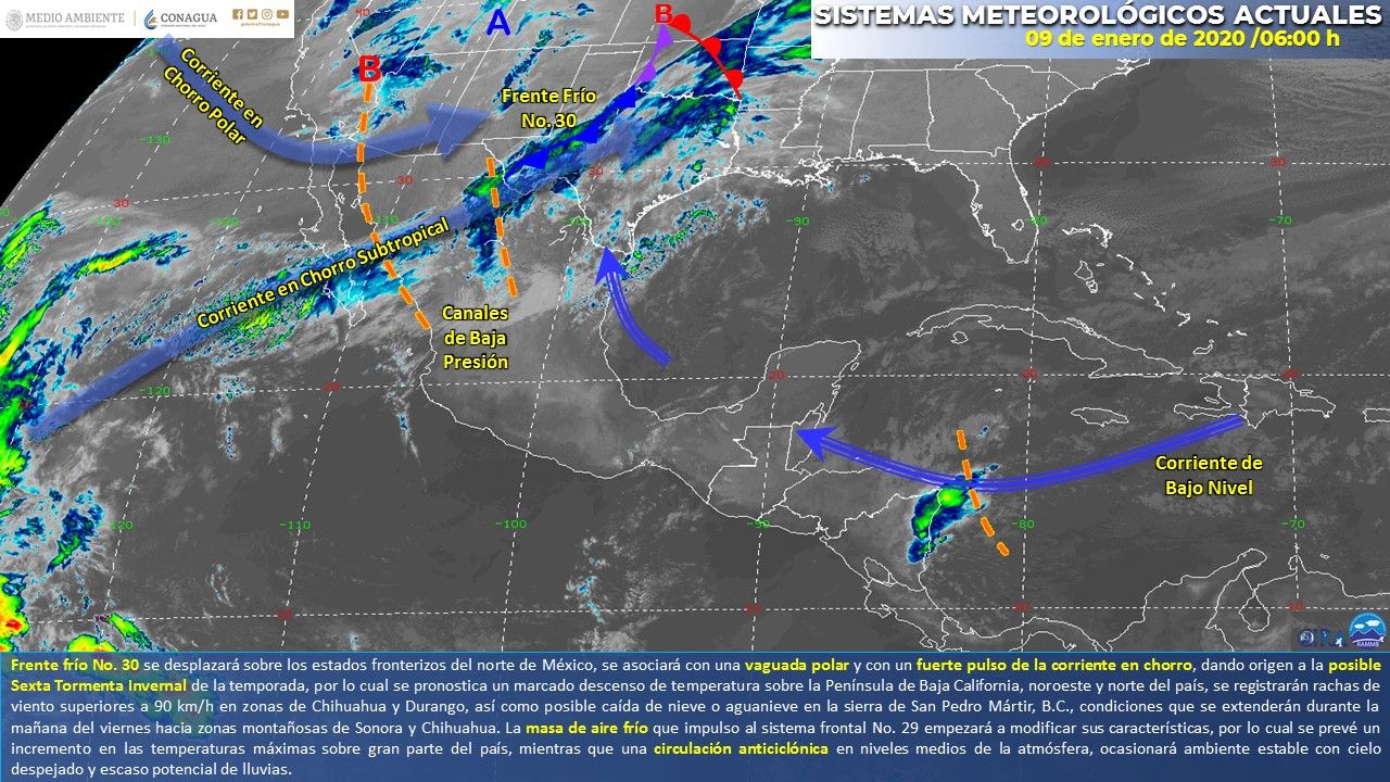 El frente frío n° 30 esta mañana se localiza cruzando entre Chihuahua y Coahuila, se prevé llegue al litoral de Texas y norte de Tamaulipas en el transcurso del día sábado y en la tarde a la sonda de campeche, para estacionarse y retraerse hacia el norte del domingo para el lunes, todos los modelos de pronósticos no indican que cruce sobre la península de Yucatán, aun así, la masa de aire polar estará favoreciendo descenso de temperaturas en la zona.