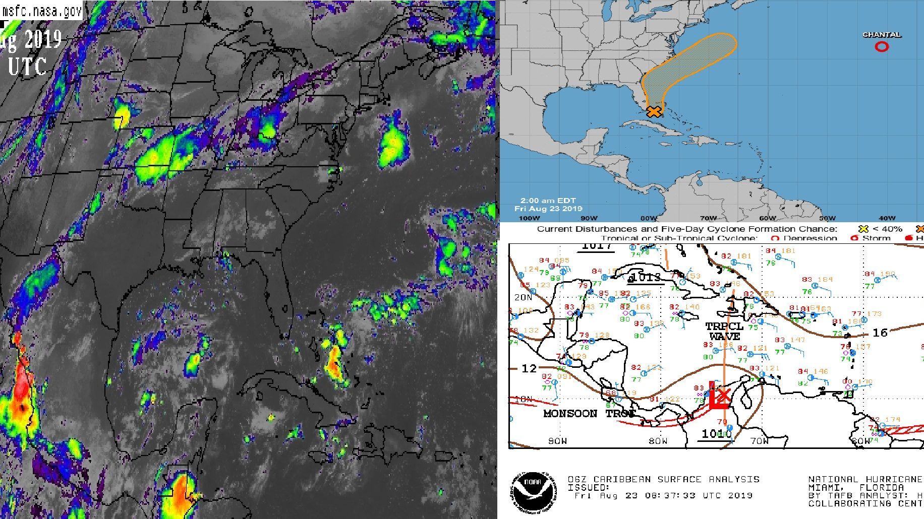 Existen remanentes de Vaguada térmica (Canal de Baja Presión) localizada en superficie sobre la porción sur del Golfo de México; que se encuentra sin movimiento aparente; en su amplia circulación periférica impulsa Aire Marítimo Tropical con poco contenido de humedad del Mar Caribe hacia la región Peninsular; mantiene la permanencia de temperaturas calurosas, nubosidad y lluvias dispersas ocasionales sobre algunas zonas de la península de Yucatán del estado de Quintana Roo, más frecuentes por la tarde.