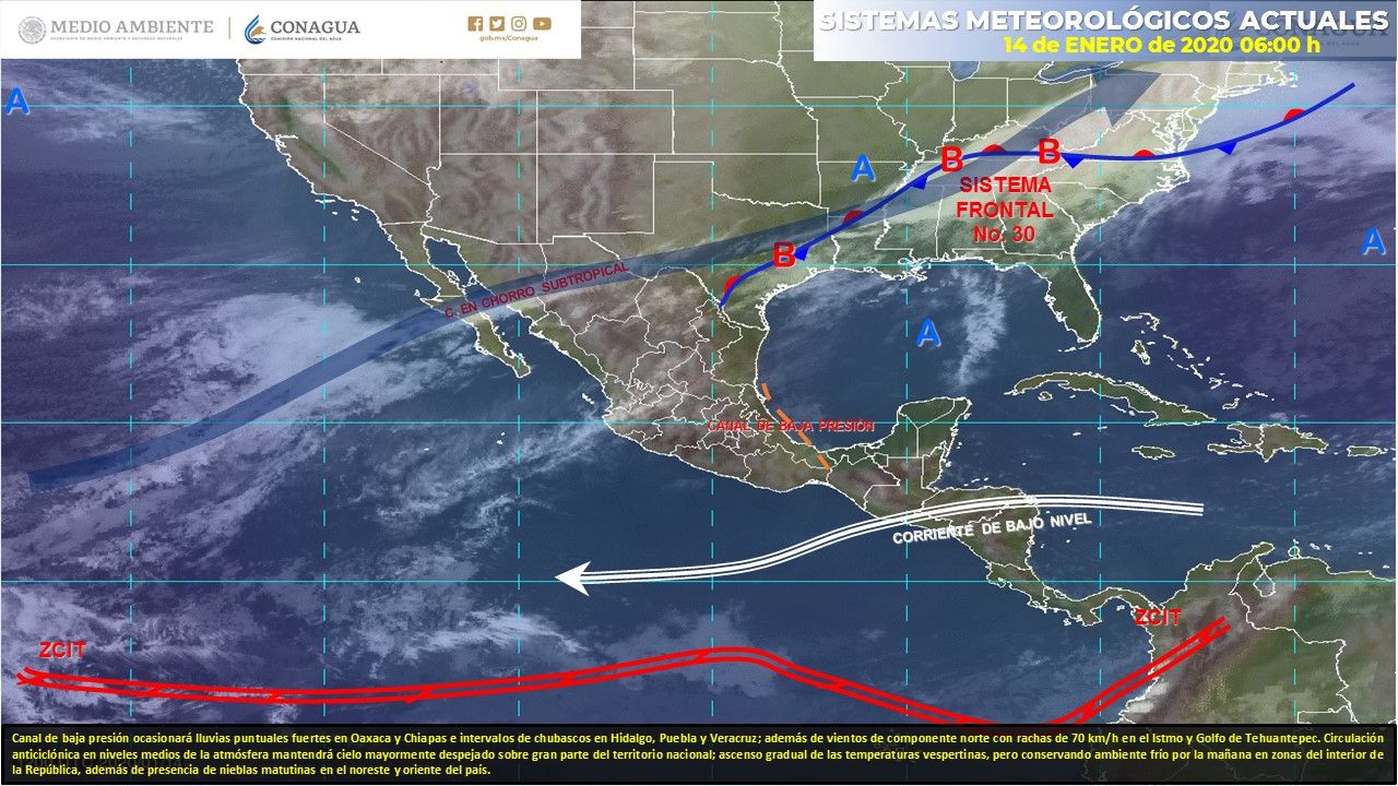 Tiempo estable y caluroso domina sobre gran parte de nuestro país por los efectos, en la periferia de altas presiones, cuyo centro de máxima barométrica, se localiza lejana de la costa este de los estados unidos, aunque sus vientos de circulación anticiclónica se mantienen de dirección este, en las aguas del caribe occidental y del sureste en las del golfo de México, donde un canal de baja presión sobre el litoral suroeste favorece algunas lluvias de forma aislada.
