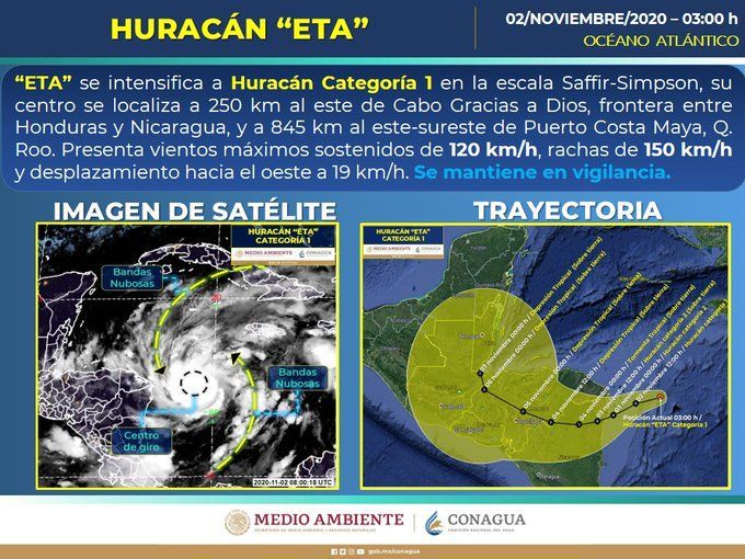 El Servicio Meteorológico Nacional (SMN) informó este lunes que Eta se intensificó a huracán categoría 1 y que su centro se localiza a 845 kilómetros al este-sureste de Puerto Costa Maya, Quintana Roo, mientras se dirige a Nicaragua y Honduras.
