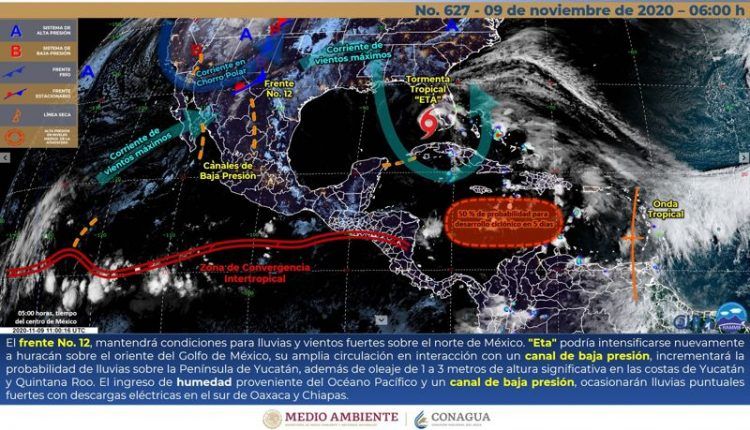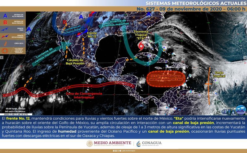 “Eta” podría intensificarse de nuevo. En las próximas 24 horas “Eta” podría intensificarse nuevamente a huracán sobre el oriente del Golfo de México, su amplia circulación en interacción con un canal de baja presión, incrementará la probabilidad de lluvias sobre la Península de Yucatán, además de oleaje de 1 a 3 metros de altura significativa en las costas de Yucatán y Quintana Roo.