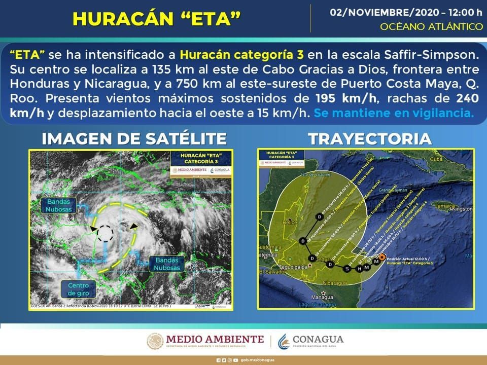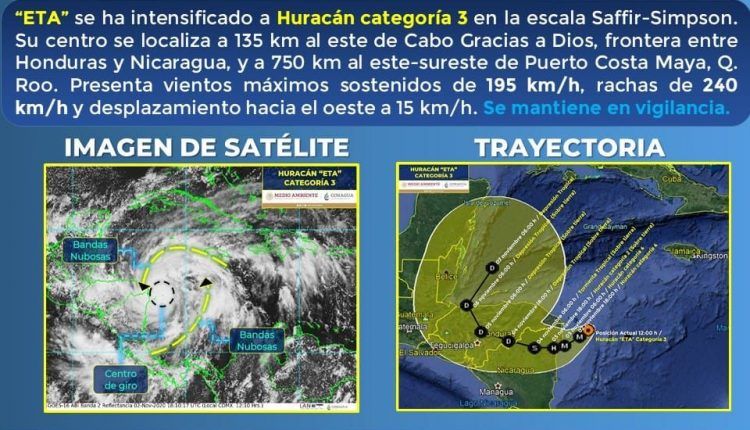 La Coordinación Estatal de Protección Civil informó que se Eta se ha intensificado a huracán categoría 3.
