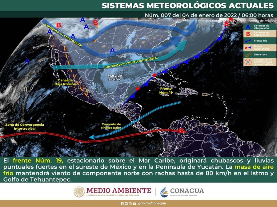 Para hoy, el frente Núm. 19 se extenderá con características de estacionario sobre el Mar Caribe y mantendrá chubascos y lluvias puntuales fuertes en el sureste de México y en la Península de Yucatán.