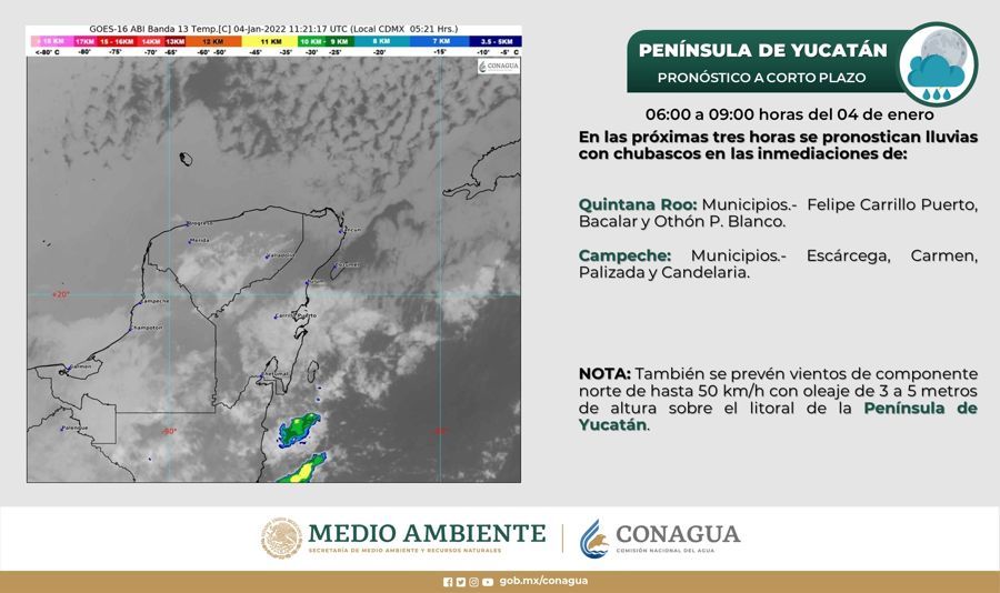 Península de Yucatán: Cielo medio nublado a nublado, con probabilidad de lluvias puntuales fuertes en Quintana Roo, chubascos en Campeche y lluvias aisladas en Yucatán. Ambiente templado gran parte del día. Viento del noreste de 10 a 20 km/h con rachas de hasta 40 km/h en las costas de Quintana Roo.