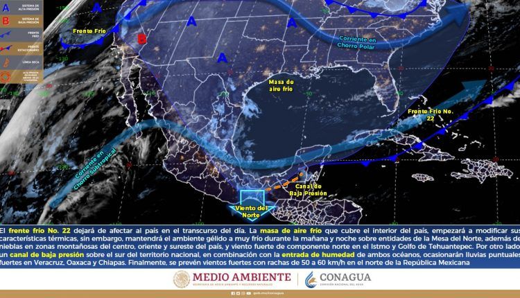 El frente frío No. 22 dejará de afectar al país en el transcurso del día. La masa de aire frío que cubre el interior del país, empezará a modificar sus características térmicas, sin embargo, mantendrá el ambiente gélido a muy frío durante la mañana y noche sobre entidades de la Mesa del Norte, además de nieblas en zonas montañosas del centro, oriente y sureste del país, y viento fuerte de componente norte en el Istmo y Golfo de Tehuantepec.