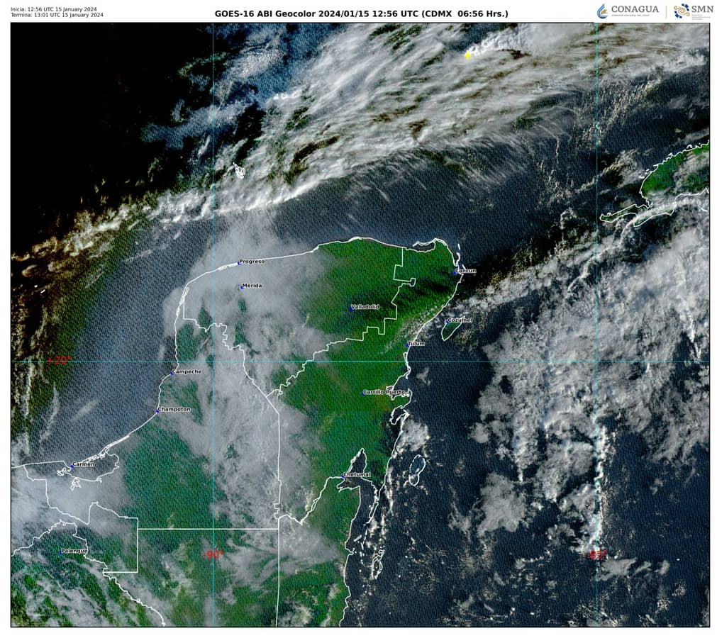Cielo medio nublado con probabilidad de lluvias aisladas en Campeche, Yucatán y Quintana Roo. Ambiente fresco a templado al amanecer y caluroso por la tarde. Viento de dirección variable de 10 a 20 km/h con rachas de 30 a 40 km/h.