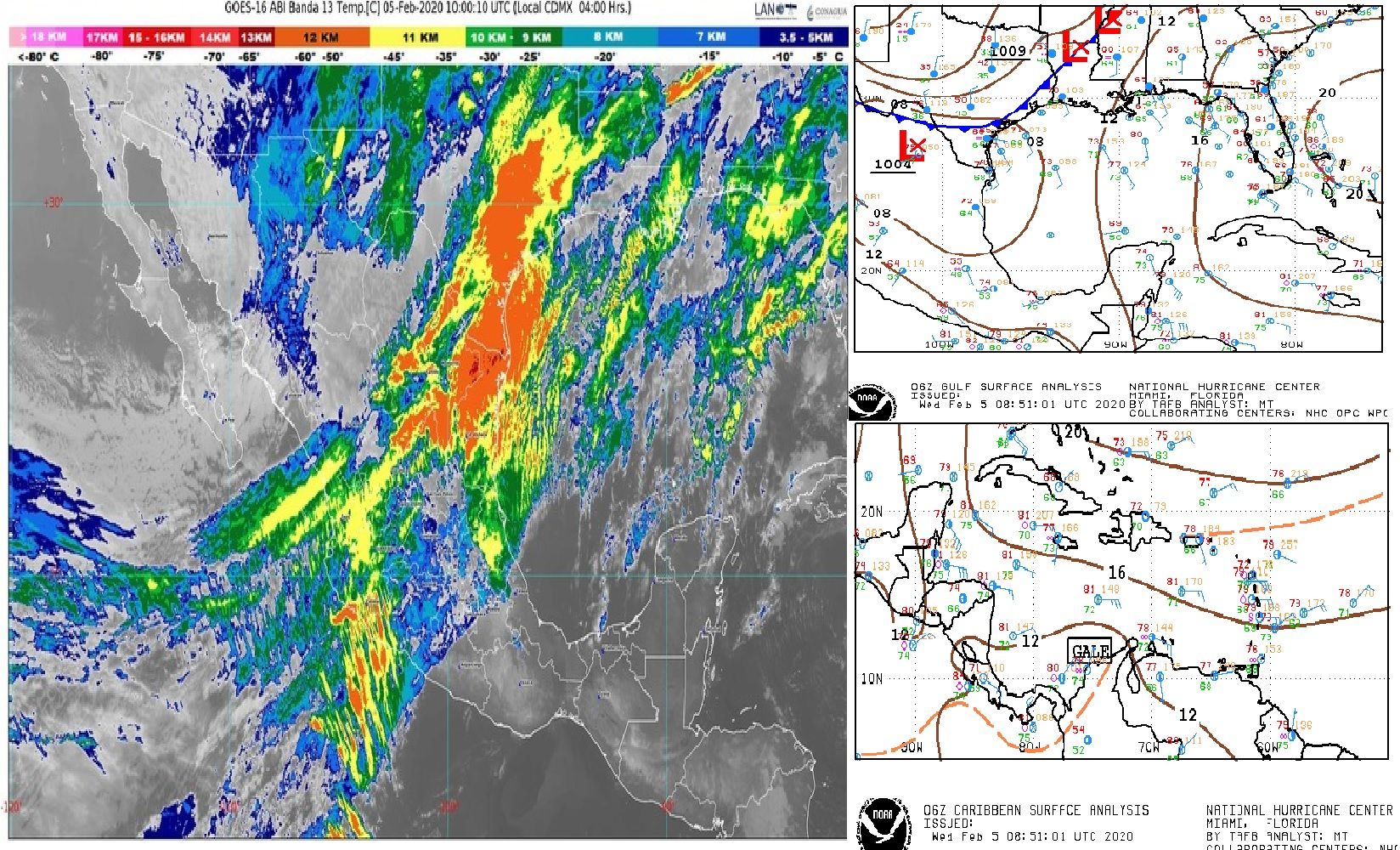 Este día, el frente No. 38 se desplazará sobre el norte y noreste de México e interaccionará con un vórtice frío que se extenderá sobre el norte del país y con arrastre de humedad de la corriente en chorro, lo cual provocará chubascos y fuertes rachas de vientos sobre los estados del norte, noreste, occidente y centro del país, incluído el Valle de México. También existen condiciones para caída de nieve y/o aguanieve sobre las sierras de Chihuahua, Durango, Coahuila, Nuevo León y Nevado de Colima, así como descenso de la temperatura sobre el noreste de México. Para la noche se registrará evento “Norte” con rachas superiores a 60 km/h y oleaje de 1 a 3 metros de altura sobre el litoral de Tamaulipas. Por otra parte, se esperan vientos del sur “Surada” en el oriente, sureste y la Península de Yucatán.