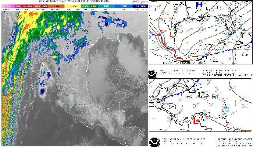Golfo de México: Cielo nublado en la región con lluvias puntuales fuertes en Veracruz y Tabasco, así como lluvias aisladas en Tamaulipas. Bancos de niebla y neblina en zonas serranas. Ambiente fresco a templado durante el día. Evento de “Norte” con rachas de 50 km/h en Veracruz (centro y sur) y en Tabasco.