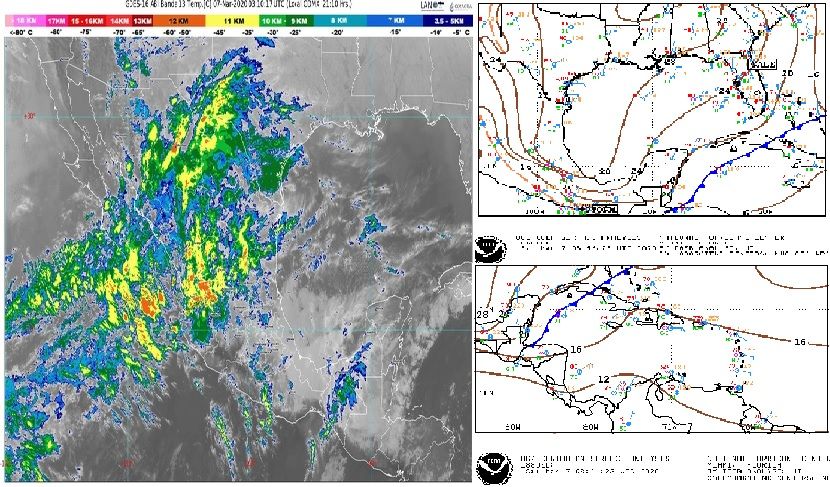 Golfo de México: Cielo nublado durante el día con lluvias puntuales fuertes en el sur de Veracruz, intervalos de chubascos en Tabasco y lluvias aisladas en Tamaulipas. Ambiente templado a fresco y bancos de niebla en zonas montañosas. Viento del este y noreste de 15 a 30 km/h en la región, con rachas de 40 a 60 km/h en costas de Tabasco y del sur de Veracruz.