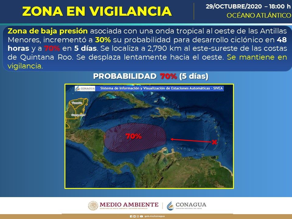((Aviso)) Zona de #BajaPresión en el mar #Caribe presenta 30% a 48 horas y 70% en 5 días para evolucionar en un sistema ciclónico. No representa riesgo para las costas de Quintana Roo, mantente informado a través de fuentes oficiales. #JuntosSaldremosAdelante pic.twitter.com/qmQcSB4e6z
