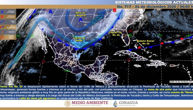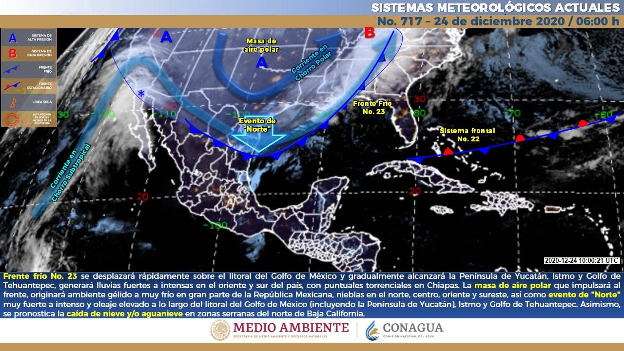 Para el día de hoy, el frente frío No. 23 se desplazará rápidamente sobre el litoral del Golfo de México y gradualmente alcanzará la Península de Yucatán, Istmo y Golfo de Tehuantepec, generará lluvias fuertes a intensas acompañadas de descargas eléctricas en el oriente y sur del país, con puntuales torrenciales en Chiapas.