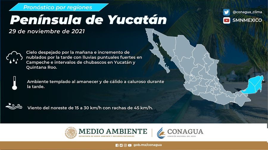Península de Yucatán: Cielo despejado por la mañana e incremento de nublados por la tarde con lluvias puntuales fuertes en Campeche e intervalos de chubascos en Yucatán y Quintana Roo. Ambiente templado al amanecer y cálido a caluroso durante la tarde. Viento del noreste de 15 a 30 km/h con rachas de 45 km/h.