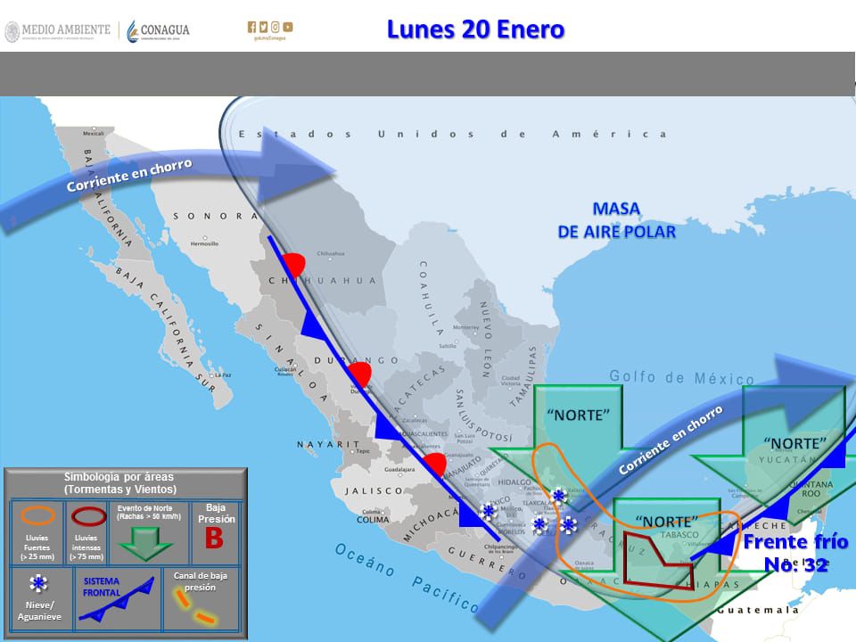 El frente frío número 32 y la masa de aire frío que lo está generando se ubican sobre el centro sur del Golfo de México, está moviéndose en dirección a la Península de Yucatán, mismos que graualmente en el transcurso de la mañana de este lunes estarán influenciando al Estado.