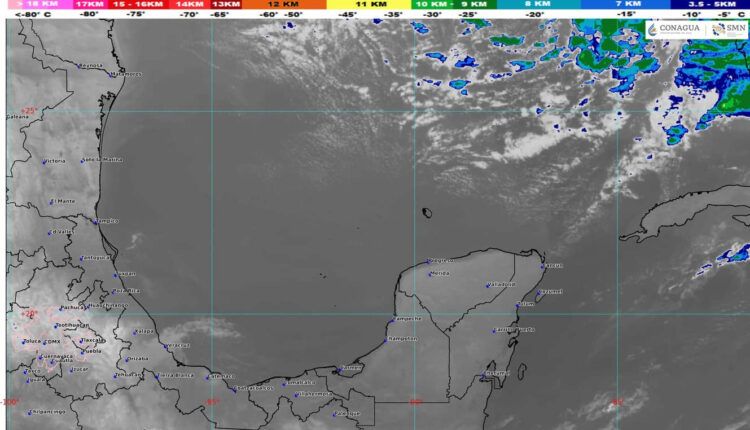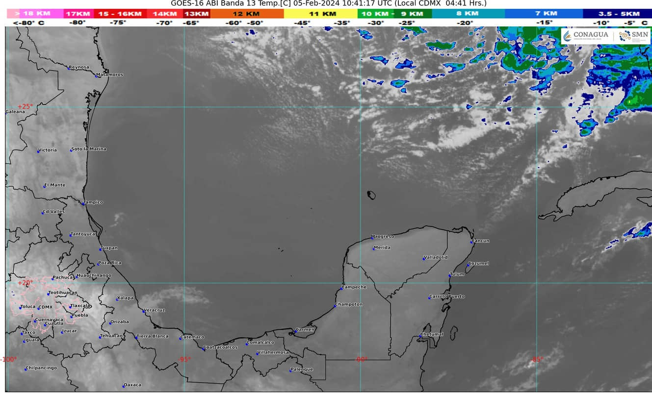 Cielo medio nublado con lluvias aisladas en Campeche, Yucatán y Quintana Roo. Ambiente templado por la mañana y cálido por la tarde. Evento de “Norte” con rachas de 60 a 80 km/h y oleaje de 2 a 4 metros de altura en costas de Yucatán y Quintana Roo; así como rachas de 40 a 60 km/h y oleaje de 1 a 3 metros de altura en costas de Campeche.