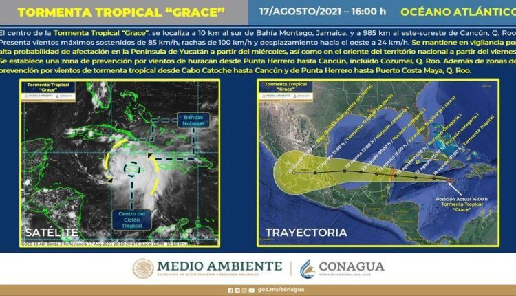 La Comisión Nacional de Agua y Saneamiento (Conagua) dijo que se espera que Grace intensifique a huracán categoría 1 y toque tierra durante la noche del miércoles o las primeras horas del jueves, sobre la costa norte de Quintana Roo.