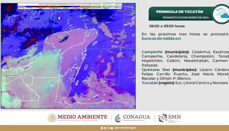 La Comisión Nacional del Agua informó esta mañana que para las próximas horas se pronostican bancos de niebla para los municipios de Lázaro Cárdenas, José María Morelos, Felipe Carrillo Puerto, Bacalar y Othón P Blanco.
