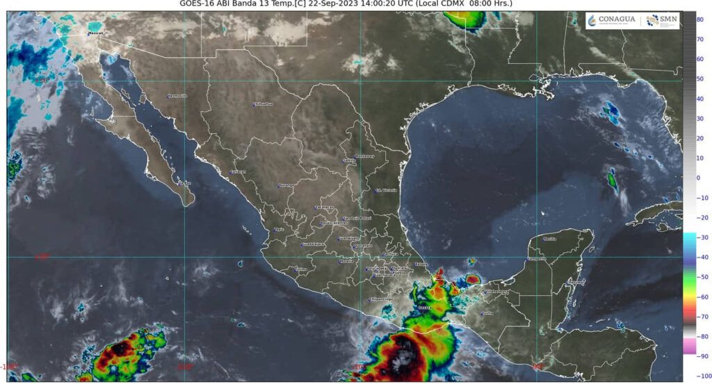 Este día, una circulación anticiclónica en niveles medios de la atmósfera, propiciará ambiente vespertino cálido a caluroso en la mayor parte del país, con temperaturas máximas superiores a los 35 °C en 21 entidades mexicanas, pudiendo superar los 40 °C en zonas de Sonora y Sinaloa. Asimismo, prevalecerán canales de baja presión en el interior del territorio nacional, aunado al ingreso de humedad del Océano Pacífico, Golfo de México y Mar Caribe, producirán chubascos en el occidente, centro y sureste de la República Mexicana, además de la Península de Yucatán, con lluvias puntuales fuertes en Veracruz, Oaxaca y Chiapas.