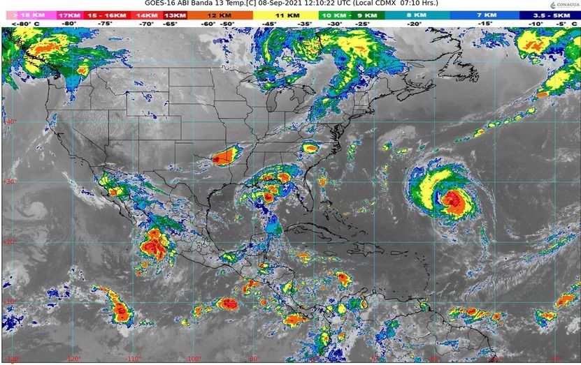 Pacífico Centro: Cielo nublado con lluvias intensas en Nayarit y Jalisco; muy fuertes en Michoacán y fuertes en Colima, todas con descargas eléctricas y probable caída de granizo. Ambiente fresco por la mañana con bancos de niebla en zonas serranas, así como temperaturas cálidas durante la tarde. Viento de dirección variable de 20 a 30 km/h en la región, con rachas de 50 a 60 km/h y oleaje elevado de 2 a 4 metros de altura en zonas costeras.