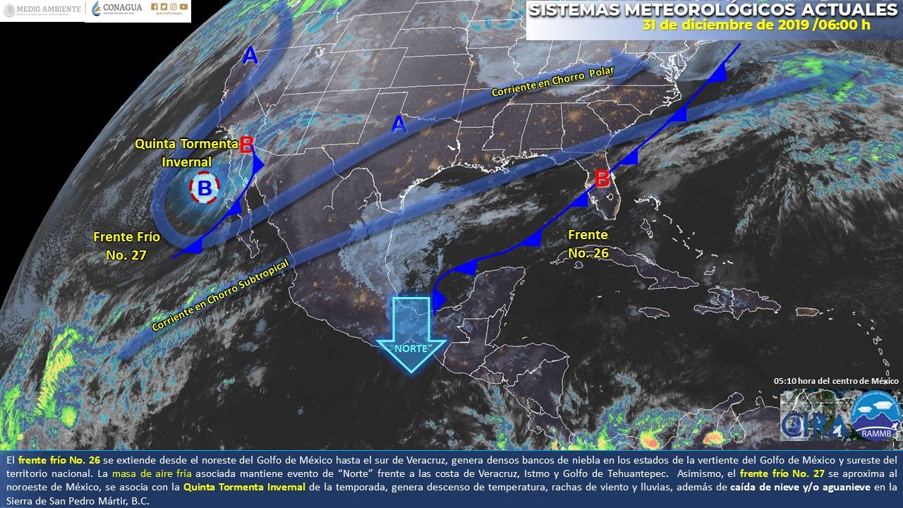 En el Golfo de México: cielo medio nublado en la región, con probabilidad de intervalos de chubascos por la tarde en Tamaulipas. Ambiente cálido durante el día. Viento del este y sureste de 10 a 25 km/h con rachas superiores a 80 km/h en el sur de Veracruz y rachas de 70 km/h en Tamaulipas y Tabasco.