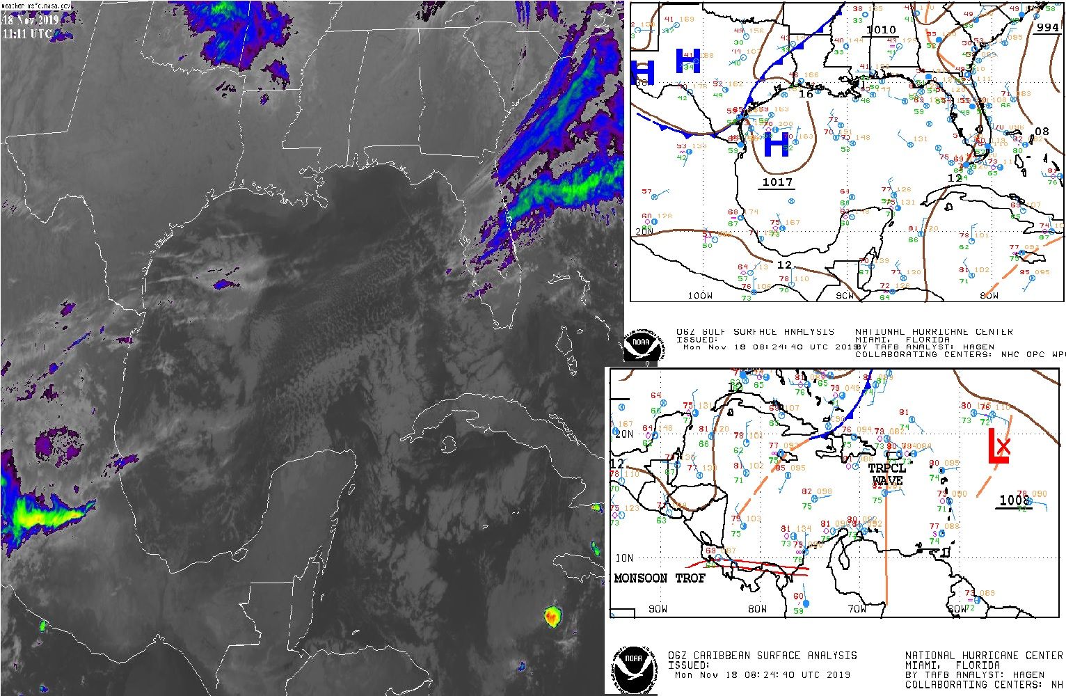 2.- Onda Tropical del Mar Caribe; localizadas en superficie, al occidente de la Isla de Puerto Rico hasta la porción oocidental de Venezuela; se mueve al suroeste provocan nubosidad y lluvias sobre su área de influencia; no presentan condiciones favorables de evolucionar en un sistema tropical, según información del centro nacional de huracanes de Miami, Florida, E.U.A.