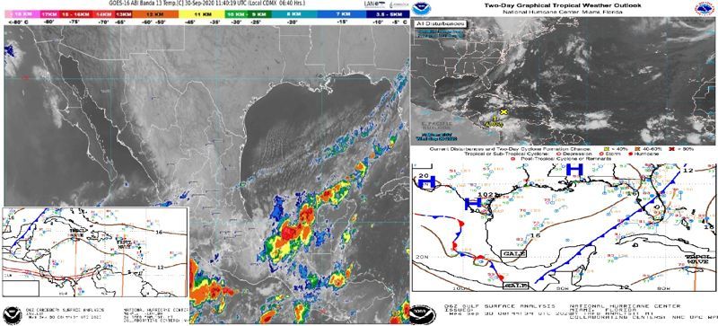 Golfo de México: Cielo nublado y lluvias puntuales extraordinarias en Tabasco, así como puntuales torrenciales en Veracruz (sur), ambas con descargas eléctricas. Sin lluvia en Tamaulipas. Ambiente templado durante el día en costas y fresco en el resto de la región. Evento de “Norte” con rachas de 60 a 70 km/h y oleaje de 2 a 3 metros de altura significante en las costas de Veracruz (sur) y Tabasco, así como en el sur del Golfo de México y la Sonda de Campeche.