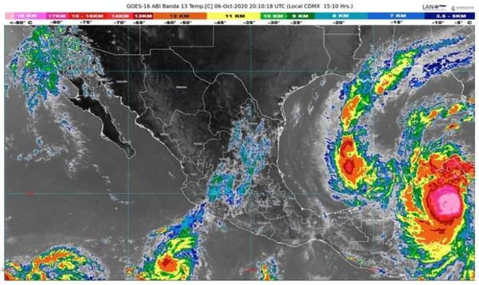 En las próximas horas, el huracán Delta, de categoría 4 en la escala Saffir-Simpson, y el paso de la Onda Tropical Número 38 por el sur del país, provocarán lluvias torrenciales (de 150 a 250 milímetros [mm]) en Campeche, Quintana Roo y Yucatán; muy fuertes (de 50 a 75 mm) en el norte de Chiapas y Tabasco, y fuertes (de 25 a 50 mm) en el noreste de Oaxaca y el sur de Veracruz.