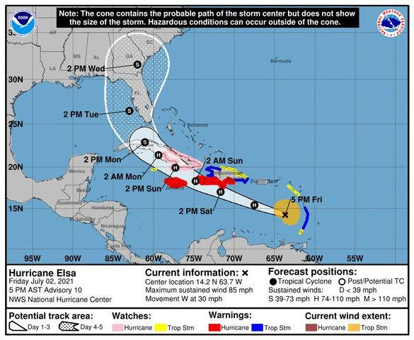 A las 5:00 horas del viernes 02 de junio, el huracán Elsa se encuentra a 815 km de Santo Domingo y a 290 km de St Vicente.