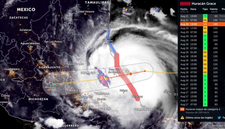 Grace en este momento se ha degradado y se encuentra en categoría 1, ya circulando por el centro del país, con vientos de 150 kilómetros por hora y avanzando a 22 kms/hr.