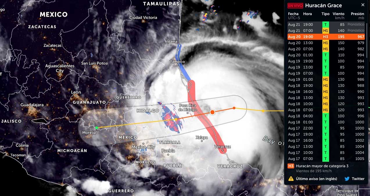 El Huracán Grace impactó costas veracruzanas la madrugada del 21 de agosto del 2021 alrededor de las 0:30 horas, con vientos sostenidos de 205 kms/hr y rachas de 240 kilómetros por hora, provocando afectaciones en la zona de Tecoluta, Nautla y Cazones, las cuales se encuentran sin energía eléctrica y con daños materiales desde las primeras horas de este día.