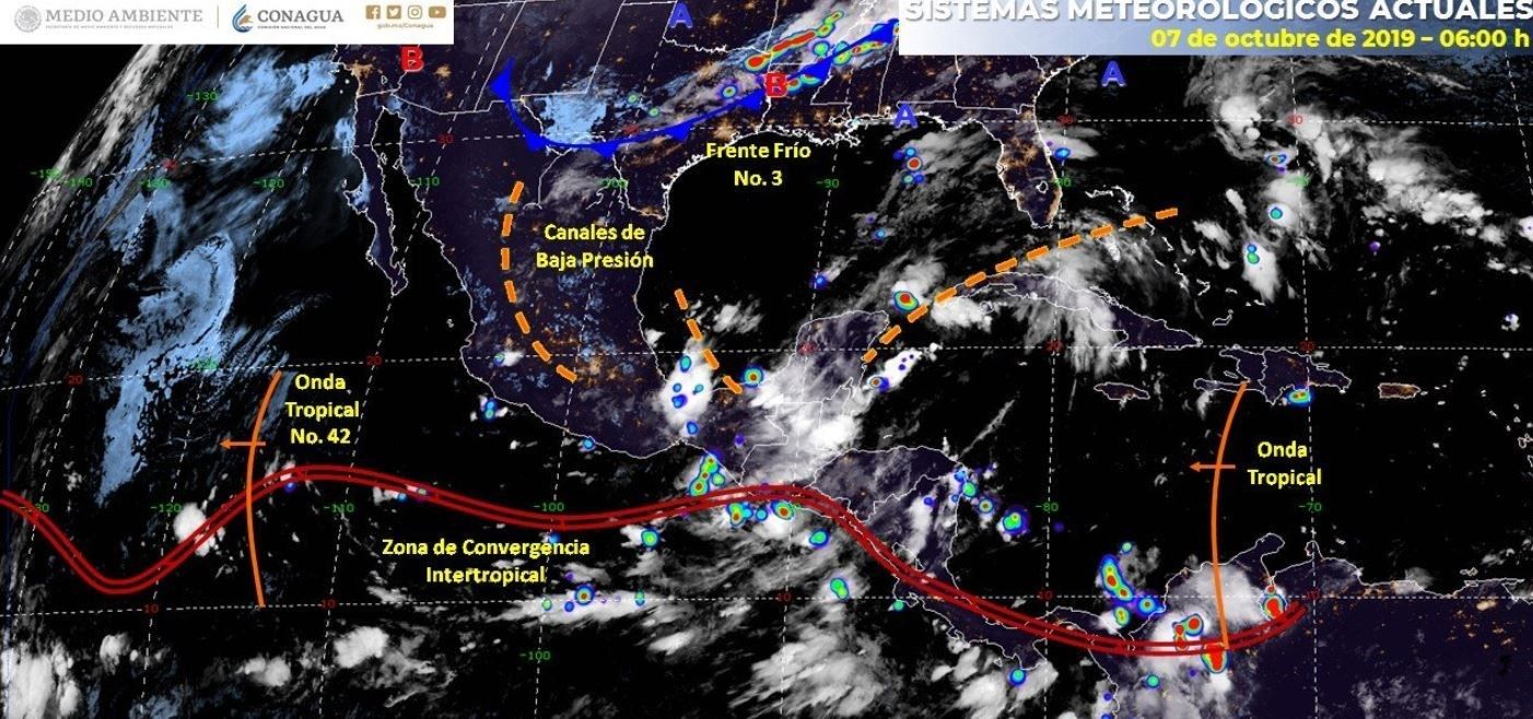 Dicho frente frío y canales de baja presión en el noroeste, occidente y en la Península de Yucatán generarán lluvias intensas en Puebla, Veracruz, Oaxaca, Tabasco, Chiapas y Yucatán, y muy fuertes en Tamaulipas, San Luis Potosí, Hidalgo, Campeche y Quintana Roo.