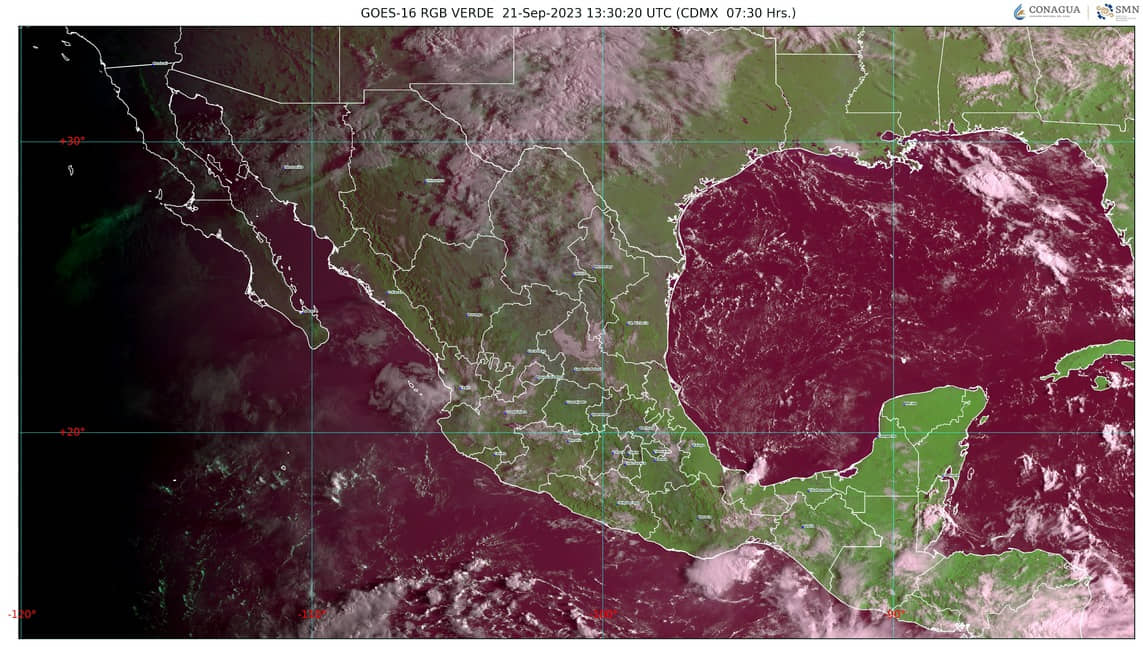 Ciudad de México, 21 de septiembre de 2023.- Lluvia y posible caída de granizo en la Península de Yucatán. Las temperaturas máximas serán de 35 a 40 °C en Veracruz, Oaxaca, Chiapas, Tabasco, Campeche, Yucatán y Quintana Roo.