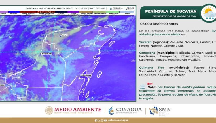 La Comisión Nacional del Agua (Conagua) informa que para las próximas horas se esperan lluvias ligeras aisladas y bancos de niebla en los municipios de Puerto Morelos, Solidaridad, Cozumel, Tulum, José María Morelos, Felipe Carrillo Puerto y Bacalar.