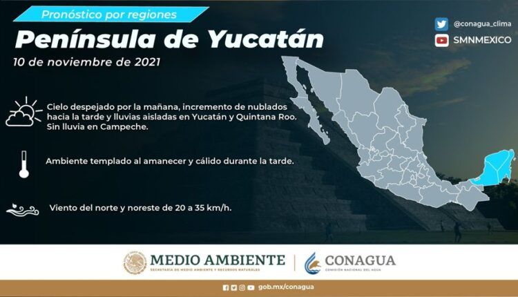Península de Yucatán: Cielo despejado por la mañana, incremento de nublados por la tarde y lluvias aisladas en Yucatán y Quintana Roo. Sin lluvia en Campeche. Ambiente templado al amanecer y cálido durante la tarde. Viento del norte y noreste de 20 a 35 km/h.