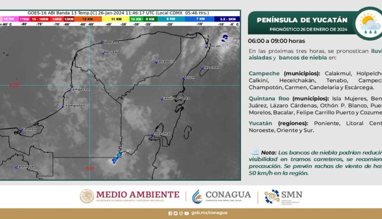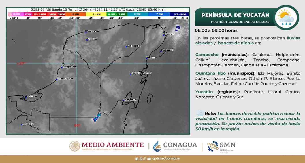 La Conagua informa que para las próximas horas se pronostican lluvias aisladas y bancos de niebla para los municipios de Isla Mujeres, Lázaro Cárdenas, Benito Juárez, Puerto Morelos, Cozumel, Othón P Blanco, Bacalar y Felipe Carrillo Puerto.