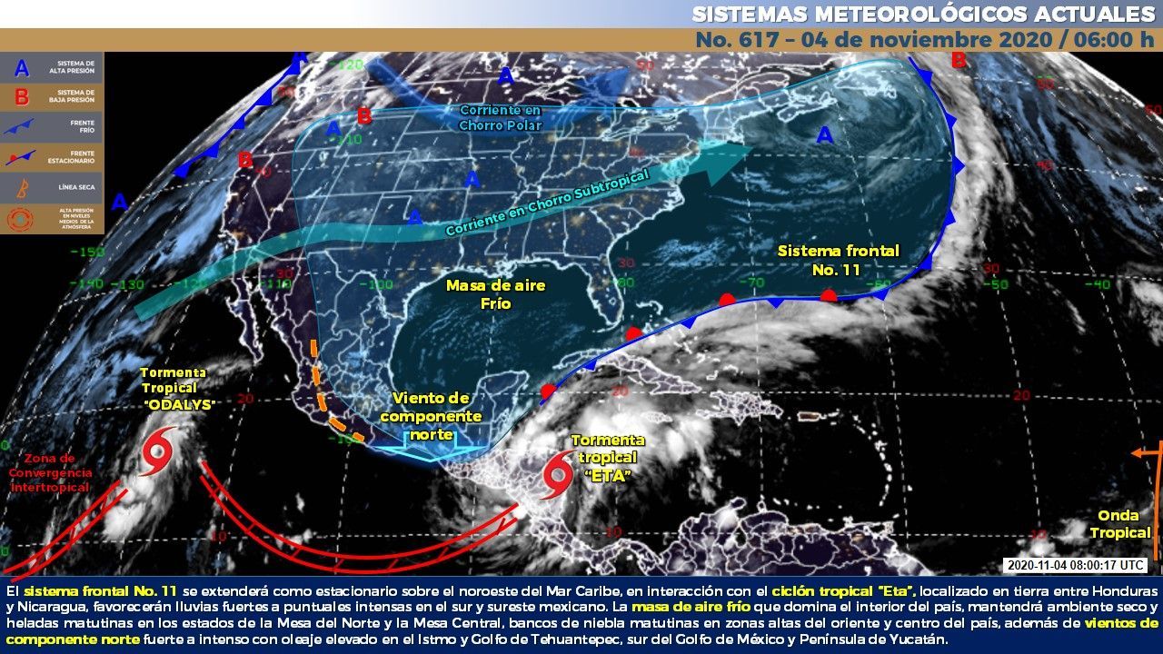 Para hoy, el sistema frontal No. 11 se extenderá como estacionario sobre el noroeste del Mar Caribe, en interacción con el ciclón tropical “Eta”, localizado en tierra entre Honduras y Nicaragua, favorecerán lluvias fuertes a puntuales intensas en el sur y sureste mexicano.