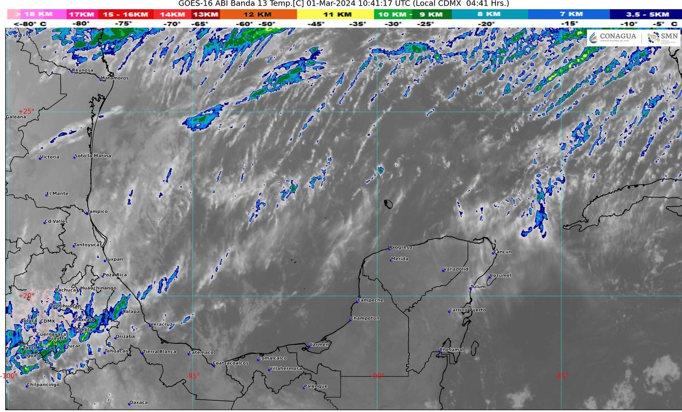 En la Península de Yucatán y Quintana Roo, se espera cielo parcialmente nublado con aumento de nubosidad durante el día. Hay probabilidad de lluvias ligeras y aisladas en algunas zonas. Las temperaturas serán calurosas durante el día y cálidas por la madrugada y al amanecer, especialmente en zonas rurales.
