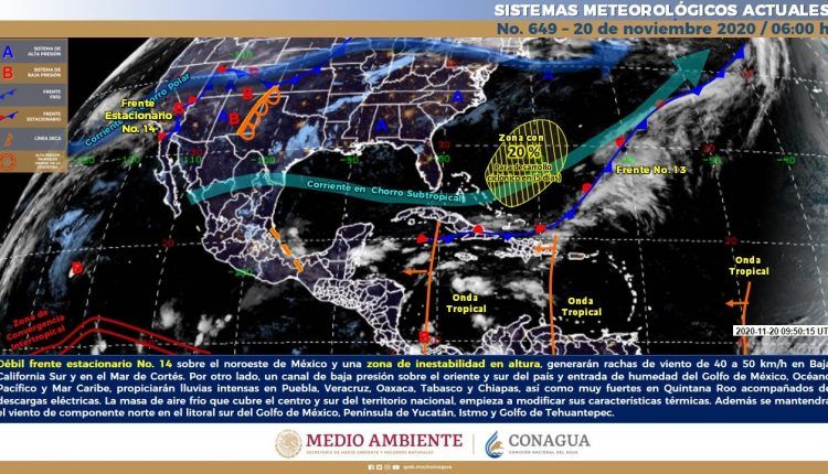 La masa de aire frío que cubre el centro y sur del territorio nacional, empieza a modificar sus características térmicas. Además se mantendrá el viento de componente norte en el litoral sur del Golfo de México, Península de Yucatán, Istmo y Golfo de Tehuantepec.