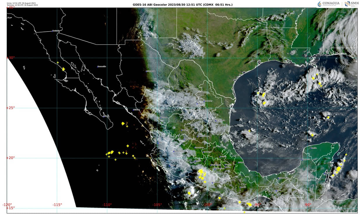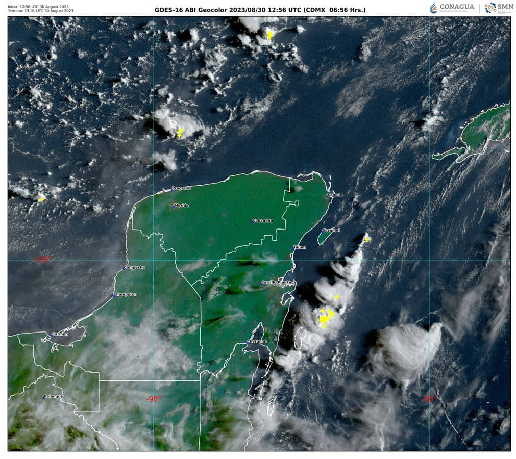Cielo medio nublado a nublado con lluvias puntuales fuertes, acompañadas de descargas eléctricas en Campeche, Yucatán y Quintana Roo, las cuales, podrían generar encharcamientos.