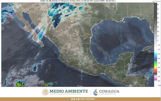 Pacífico Sur: Cielo nublado por la tarde con intervalos de chubascos en Chiapas, Oaxaca y Guerrero, además de descargas eléctricas en este último. Temperaturas frías con bancos de niebla matutinos en zonas serranas de Oaxaca y Chiapas. Ambiente cálido por la tarde en zonas costeras. Viento de componente norte con rachas de 50 a 60 km/h en el Istmo y Golfo de Tehuantepec.