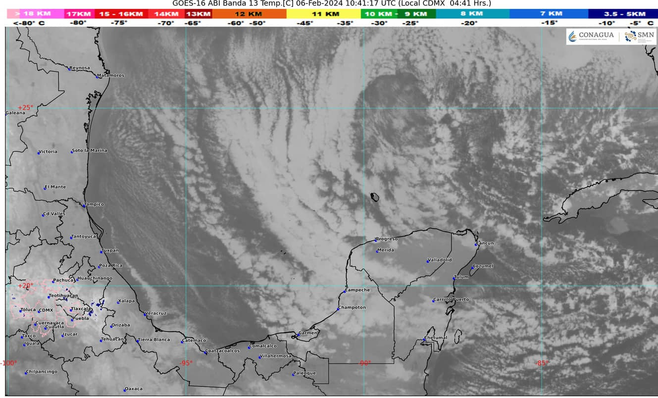 Cielo medio nublado a nublado con lluvias aisladas en Campeche, Yucatán y Quintana Roo. Ambiente fresco por la mañana y templado por la tarde. Evento de “Norte” con rachas de viento de 40 a 60 km/h y oleaje de 1 a 3 metros de altura durante esta mañana en costas de Campeche, Yucatán y Quintana Roo.